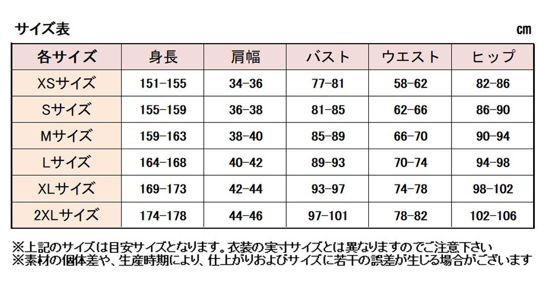 中には衣装の実寸サイズを掲載している商品もございますが衣装の種類によっては着用感、サイズ感が異なります。その為、普段ご注文されるサイズでも着用出来ない場合がございますのでお気をつけ下さい。