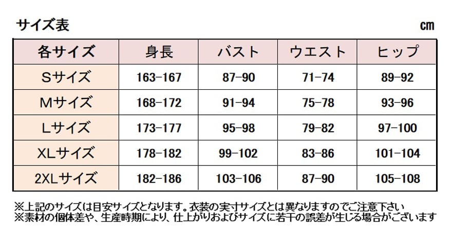 中には衣装の実寸サイズを掲載している商品もございますが衣装の種類によっては着用感、サイズ感が異なります。その為、普段ご注文されるサイズでも着用出来ない場合がございますのでお気をつけ下さい。
