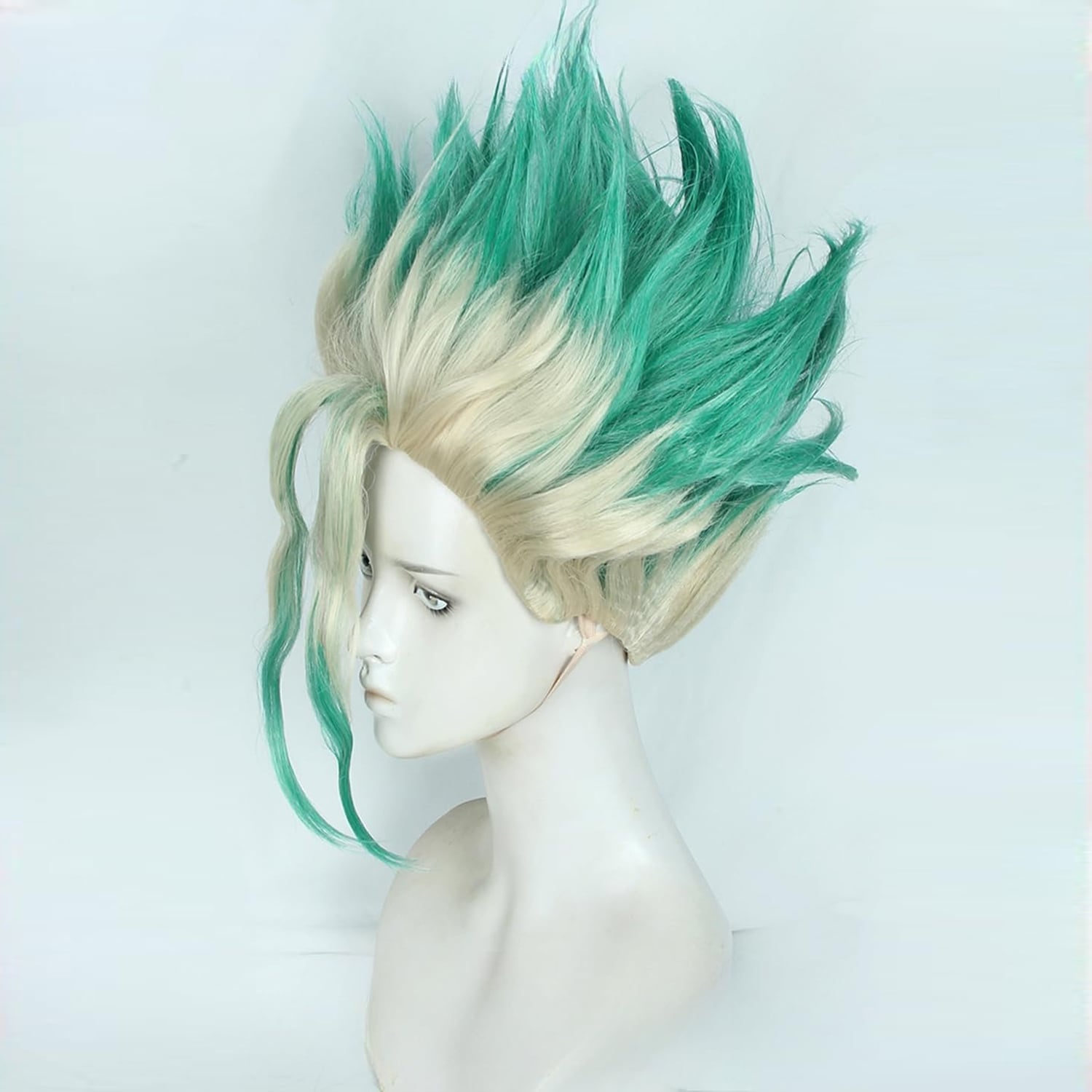 コスプレ耐熱ウィッグ ライトゴールド グリーン 2トーン ミディアム キャラクターウィッグ ★Dr.STONE/石神千空 等 ★受注品★