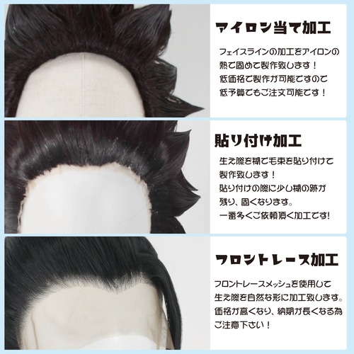 前髪の立ち上げや形の固定にはワックスを使用して製作しております。製作時の接着剤が一部ウィッグに付着している場合がございます