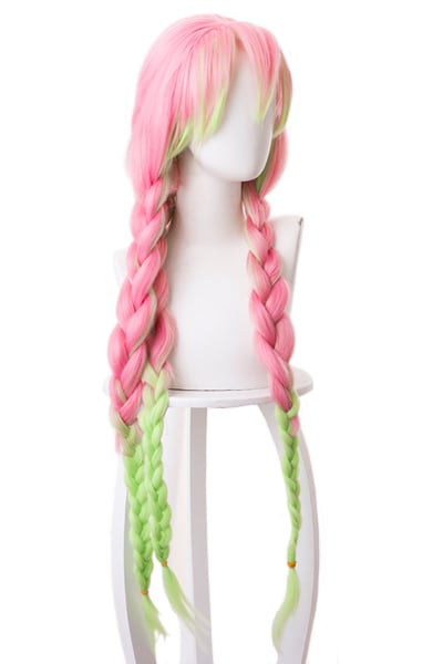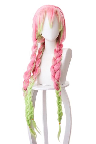 【487H】コスプレ耐熱ウィッグ ローズピンク ライトグリーン三つ編みウィッグ ★鬼滅の刃/甘露寺蜜璃 等 ★受注品★