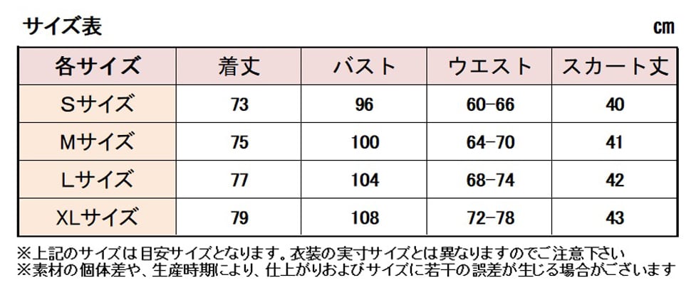 中には衣装の実寸サイズを掲載している商品もございますが衣装の種類によっては着用感、サイズ感が異なります。その為、普段ご注文されるサイズでも着用出来ない場合がございますのでお気をつけ下さい。