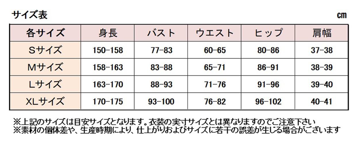 中には衣装の実寸サイズを掲載している商品もございますが衣装の種類によっては着用感、サイズ感が異なります。その為、普段ご注文されるサイズでも着用出来ない場合がございますのでお気をつけ下さい。