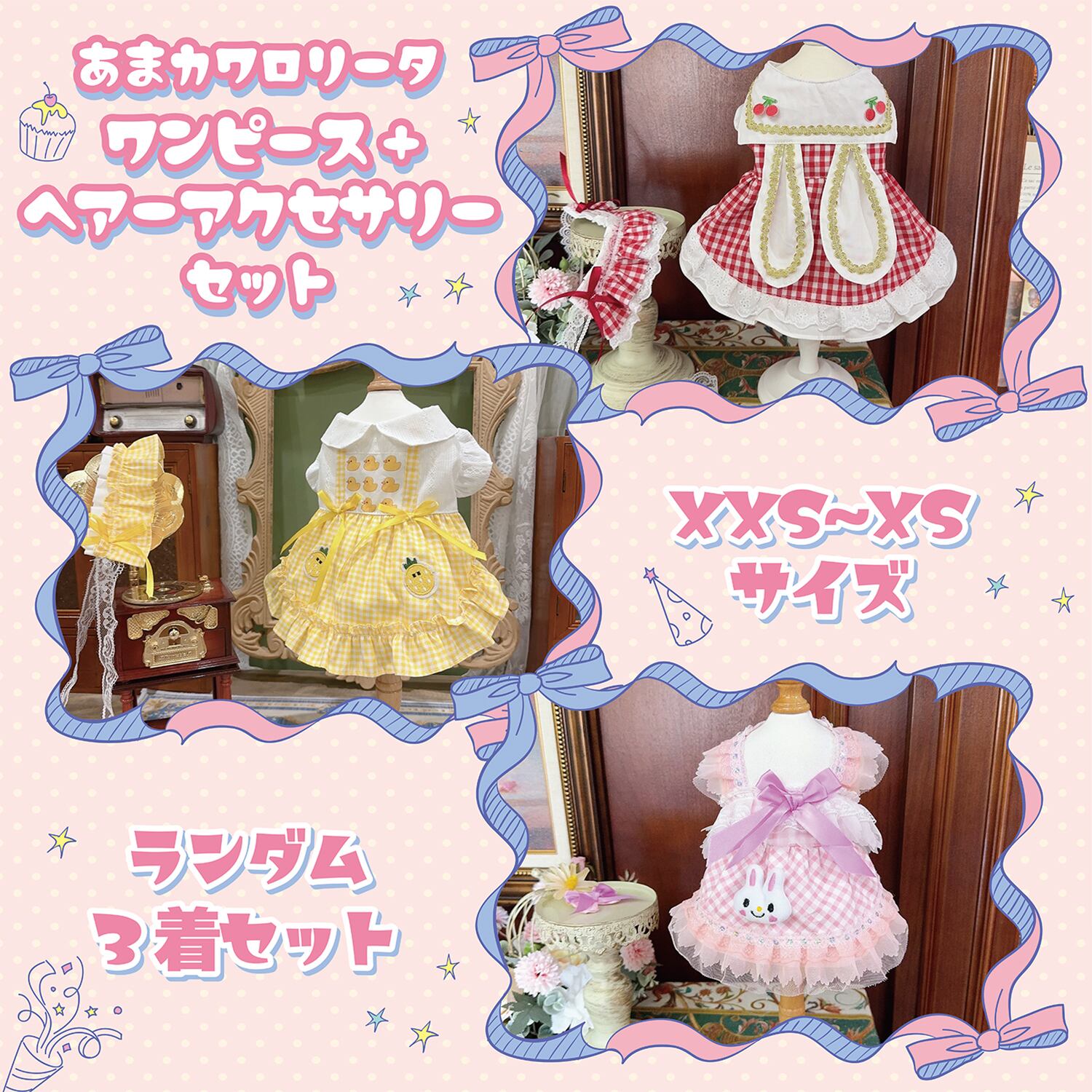 《ランダム3着セット》ペット用 コスプレ衣装 猫服 犬服 ゴスロリ 可愛いドレス ワンピース 【衣装+髪飾りセット】【XXS~XSサイズ】 ★受注品★