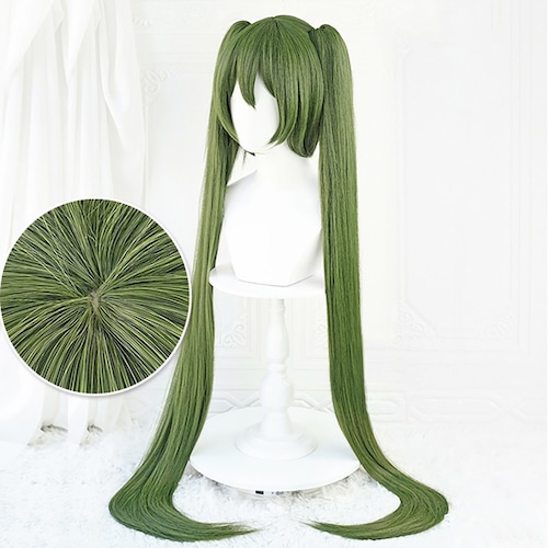 【C20-1-2】コスプレ耐熱ウィッグ モスグリーン ツインテール バンス付きウィッグ ★VOCALOID/初音ミク 千本桜 ★受注品★